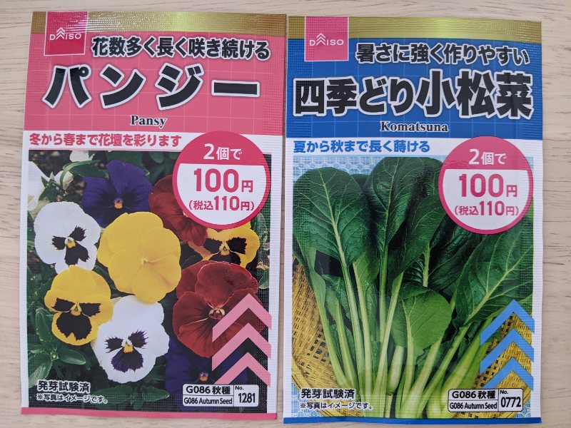 ダイソーでパンジーと小松菜の種を購入した。2つで110円だった。
